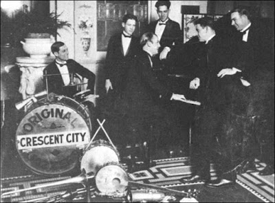 Original Crescent City Jazzers – L to R:Felix Guarino, Sterling Bose, Johnny Riddick, unknown, unknown, Avery Loposer. |